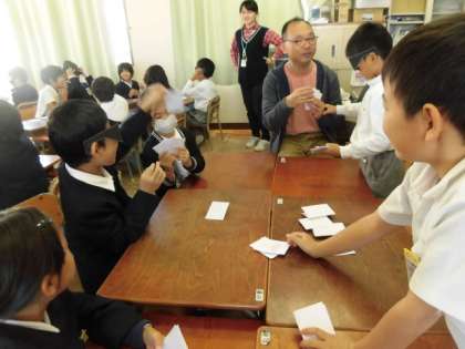 写真は、見える人、見えづらい人、見えない人が共に楽しめる、ユニバーサルデザインのカードゲームを作り、交流している様子です。
