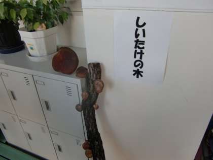 冬休みの間もえの森の花に水をやりに来てくださっていた地域の方が、故郷の宇和島から、シイタケのほだぎ(原木)を採ってきてくださいました。去年の2月に菌を植えたものだそうです。大小のシイタケが育っています。肉厚で大変おいしそうです。
