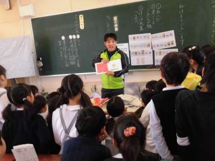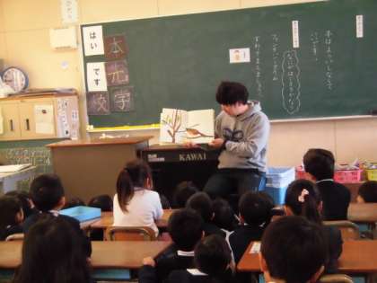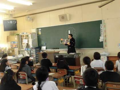 低学年の教室がある東校舎全体が、ファンタジーの世界に迷い込んでいるかのようです。子どもたちは瞳を輝かせて、お話に熱中していました。