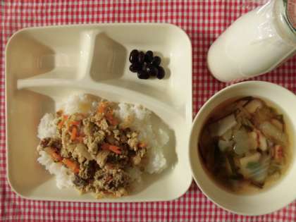 他人丼、すまし汁、黒豆の煮もの、牛乳 でした。