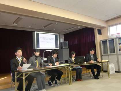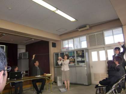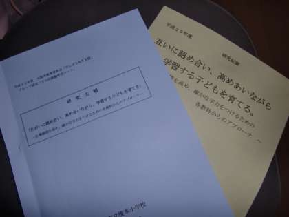 「若手教員の育成」と「児童の体力向上」を柱に取り組んできた内容について発表しました。写真右は、遠投の力を伸ばすために工夫した、自作教材を使っての実演場面です。発表後は会場から質問もいただき、場を盛り上げていただきました。