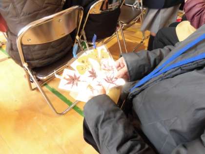 閉会式では、お礼の言葉とともに、えの森の落ち葉でつくったしおりをプレゼントしました。