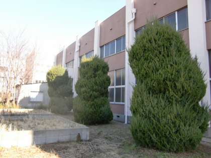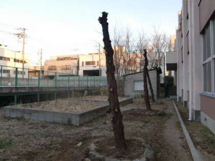 講堂の西側、プールとの間のスペースに、5年生が「榎本米」を収穫した水田があります。ここにも、大きな「カイズカイブキ」が3本ありました。