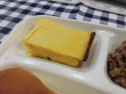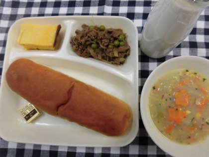 牛肉のデミグラスソース煮、コーンスープ、かぼちゃのプリン、大型コッペパン、バター、牛乳 でした。
