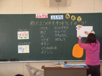たまごのなかから何が出てくるか、子どもたちは想像の翼を広げて表現します。「デカルコマニー」「スパッタリング」といった技法にも興味を持ち、集中して作品を仕上げていきました。