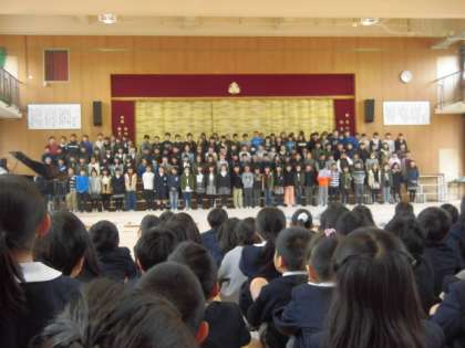 今日は、本番に向けてのリハーサル。「よろしければ見に来てください」との6年生からのお誘いに、5つの学級が鑑賞に来ました。