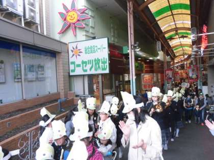 うららかな春の日差しのもと、みゆき通り商店街と、放出商店会を練り歩きました。