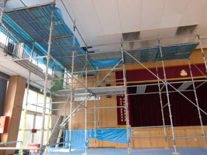 入学説明会が終わり、次の土曜授業までに間に合うよう、講堂の雨漏り補修工事が始まりました。足場を組んだ後は、講堂の手前半分だけしか使えないという1週間ですが、グランドピアノと舞台正面、ギャラリーの上部からの雨漏りが特にひどいため、このままでは安心して卒業式を迎えることができません。
