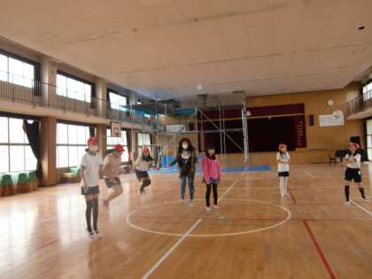 写真右は、足場の前でなわとびに取り組んでいる5年生です。