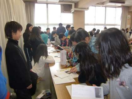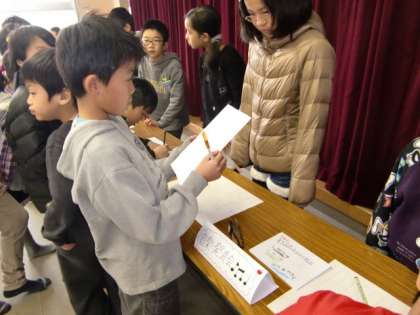今日はいよいよ、5年4組が4年1組を招待しての「リーフレット紹介」です。4年生は、1枚1枚じっくり見ながら、感想を書き込んでいました。