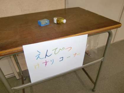 部屋の片隅には、アンケートに書き込むための鉛筆を削る、「えんぴつけずりコーナー」までつくるという、行き届いたおもてなしぶりです。