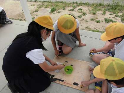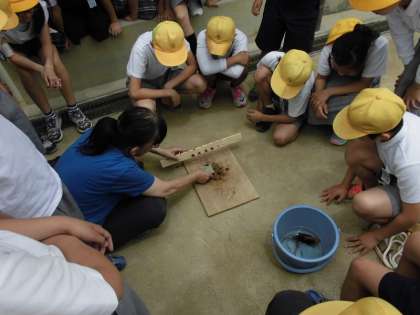 16日(火)、6年生社会科の出前授業として、大阪府立弥生文化会館の方々をゲストティーチャーに迎え、弥生時代の人々の暮らしに迫る体験的な学習を実施しました。桜ヶ丘銅鐸の絵について考え、石器体験や火起こし体験を通して弥生時代の人々の生活を学びました。石器でポリシートを切ったり、グループで協力をして火起こしをしたりして、弥生時代の人々の工夫を学ぶとともに、豊かな暮らしに思いをはせることができました。