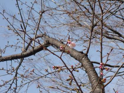 折しも今朝、えの森の桜に、はじめの一輪がほころびました。