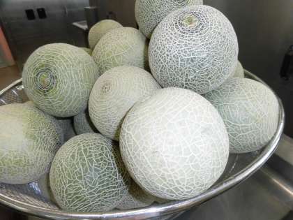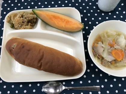 献立は、カレードリア・キャベツのスープ・クインシーメロンと干しブドウパンです。メロンは、年に1回の登場です。少しずつスプーンで切りながら食べます。