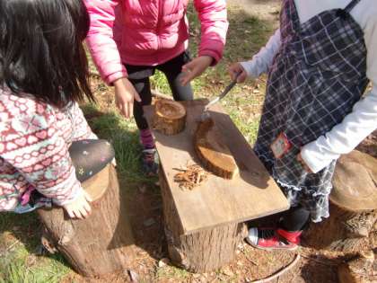 中央の写真は、森のすみっこの、大きなクスノキの近くです。丸太や木切れや小枝を使った、なにやらお家の台所のような空間ができています。近づくと、「いっらしゃいませ〜!」と迎えてくれました。どうやら「パンケーキ屋さん」のようです。子どもは遊びの天才ですね。いろいろな遊びを発明して、思い思いに楽しんでいます。