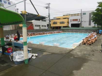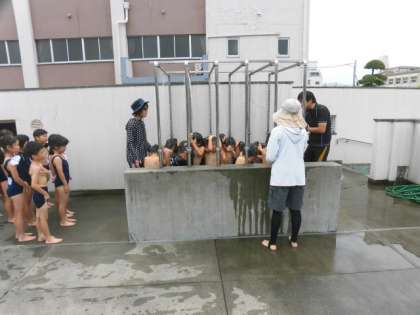 梅雨空ではありましたが、雨が止んでお日様も少し顔を出す天候。プール日和とまでは言えませんが、十分にプールに入ることのできる天候になりました。月曜日は、1年、3年、4年、5年がプール開きでした。水泳指導を通しての体力づくりと水遊びや浮く、泳ぐなどの運動を通して水中での安全を学びます。1年生も初めてのプールに歓声が上がりました。でも、お話を聞く大切な場面ではきちんと静かにお話を聞くことができました。