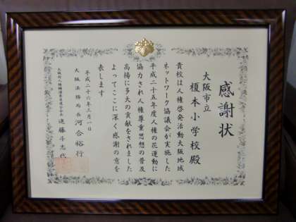 今日、人権の花運動に協力したとして、感謝状と、「人KENまもる君」「人KENあゆみちゃん」のマスコット人形を贈呈していただきました。キャラクターは、子どもたちの大好きな、故やなせたかしさんのデザインです。