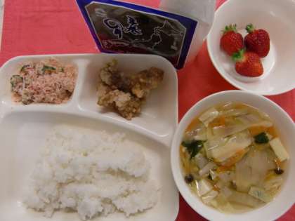 いそべご飯(あげどりのしょうがじょうゆかけ、かにときゅうりの甘酢、手巻き焼きのり)、ゆばのすまし汁、いちご、牛乳 です。
