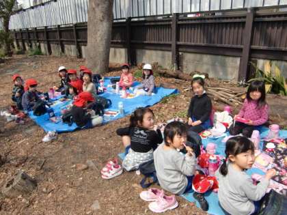 4時間目。榎本幼稚園のお友だちが、お弁当を食べにえの森へやってきていました。桜の下のテーブルで食べる子たち、ケヤキの下にシートを敷いて食べる子たち。春の日差しのもと、みんなとっても美味しそう。まるで春の遠足のような雰囲気です。