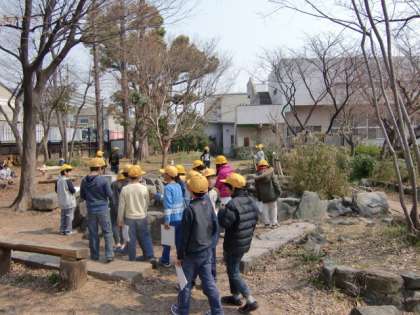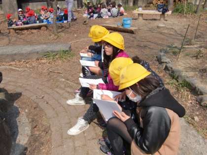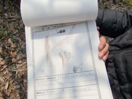 幼稚園児がお弁当を食べているころ、4年生はえの森で春を探していました。観察カードの「サルスベリ」に、なぜか木から落ちるサルの絵まで描いている子がいます。