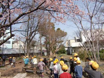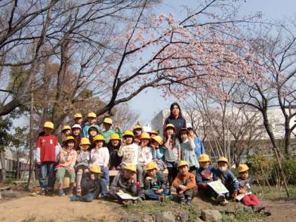 今日もらった「えの森マップ」を手に、1年4組のみんなでえの森へ行きました。せっかくの機会なので、学級全員で、桜の木の下で記念写真も撮りました。