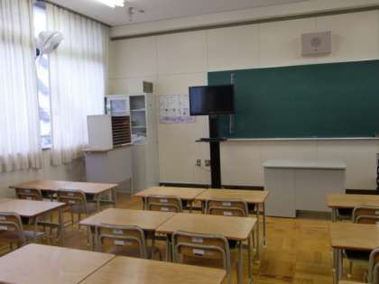 <写真 右> 学級増となる教室も、着々と準備を進めています。今日は、真新しい机と椅子、テレビ、戸棚などが納入されました。