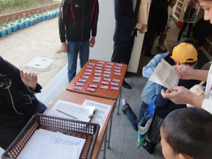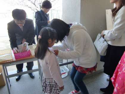 昨日の雨もあがり、晴天のもと、166名の1年生を迎えて、入学式を実施しました。6年生のおにいさん、おねえさんに名札をつけてもらい、ちょっぴり緊張の面持ちで教室に入りました。