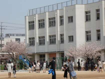 入学式が終わり下校するころには、気温もぐんぐん上がり、玄関の看板の前には、記念撮影のための列ができていました。