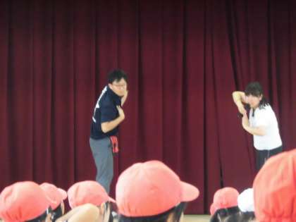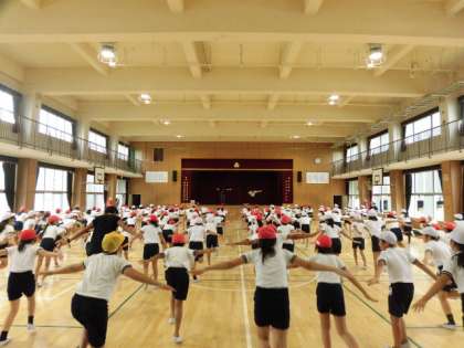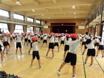 4年生も、体育館で団体演技の練習を始めています。先生がされるお手本を参考にしながら、踊り始めているところです。4年生らしい大きな動きを目指しています。はつらつとした動きも見どころです。