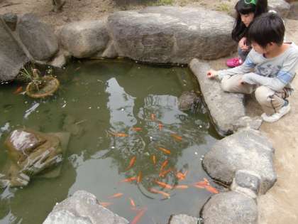 左の写真は、地域の方からいただき、亀池に放した金魚たち。立派に育っています。以前からいる亀やメダカとも、仲良く暮らしています。