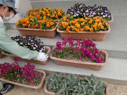 右の写真は、種花事業からいただいた、色とりどりの花の苗。どれも美しく育っています。右下の葉だけの苗は「白妙菊」でしょうか?大事に育て、花を咲かせたいと思いますが、葉だけでも、とてもきれいです。