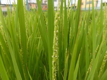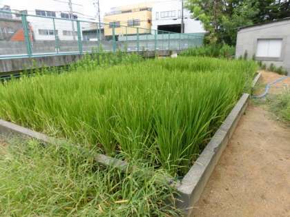 5年生。プール横の田んぼで稲作学習をしています。今日、稲の花が咲きました。白い小さな花です。ちゃんと雄しべと雌しべがあります。お世話をしていただいている地域の方から、「この後受粉をして実が入るんですよ」と教えていただきました。実が入ると、稲穂が下がってくるとのことです。待ち遠しいですね。
