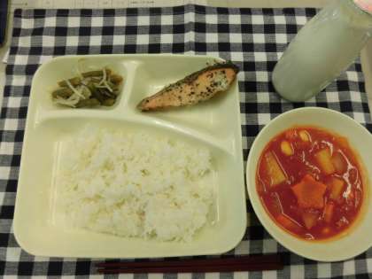 今日の献立は、「さけのバジル焼き」「大豆とごろごろ野菜のトマト煮」「三度豆ともやしのサラダ」です。タイトルにもあります優秀賞作品の献立です。魚・大豆・野菜を使った洋風の健康メニューとなっています。
