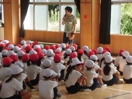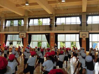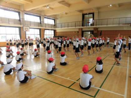 2年生。体育館で団体演技の練習です。一人一人の動きをお互いで確かめ合って、動きを高めています。のりのりの2年生です。