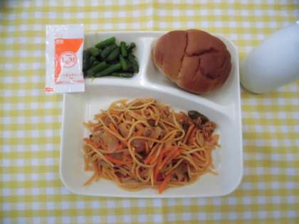 今日の献立は、「イタリアンスパゲッティ」「グリーンアスパラのサラダ」「黒糖パン」「牛乳」です。サラダには、ノンエッグマヨネーズがついています。卵を使っていないマヨネーズ風味の調味料です。卵アレルギーの人も食べることができます。