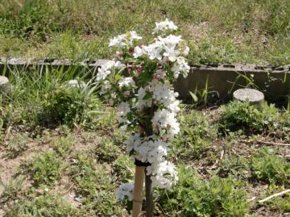 <写真 中> ハナリンゴ:背の低い苗に、たくさんの花がつきました。近くに植えた「ヒメリンゴ」もそろそろ花が咲き始めています。