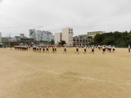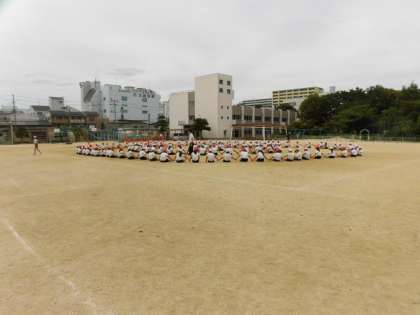 6年生組立体操。運動場で、隊形を意識しながらの練習をしています。全体の広がりを感じながら動かないといけません。高度な練習です。