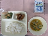 今日の献立は「鶏肉とてぼ豆のスープ煮」「じゃがいもとトマトのチーズ焼き」「黄桃(缶詰)」「食パン」「牛乳」です。