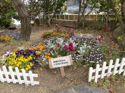 右の写真は、先日「種花事業」からいただいたお花です。元気に育っています。「地域の方から いただいた お花です」という看板も立ててあります。
