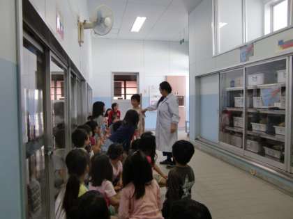 給食を作っている「きゅうしょくしつ」ものぞかせてもらいました。給食担当の藤本先生のお話をしっかりと聞き、お鍋をかき混ぜる大きな「かい」と、背比べをさせてもらいました。