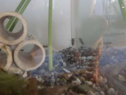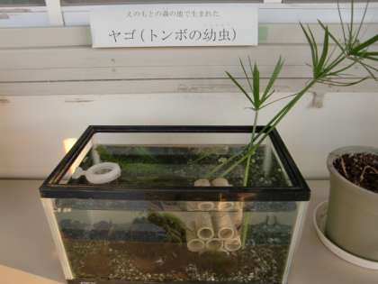 池の水と 池の葉っぱと一緒に、水槽に入れて職員室の前に飾りました。