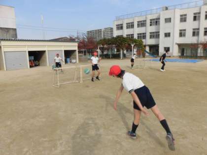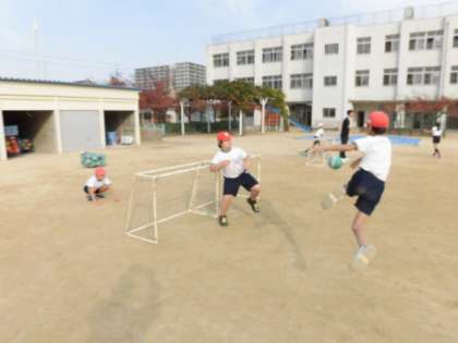 6年生の体育は、ハンドボールです。順番にシュート練習。さまざまな角度から、ジャンプしてシュート!決まった時は、「やったー」と喜んでいます。