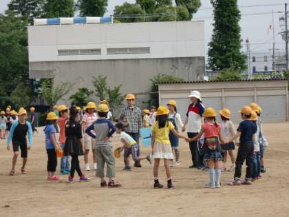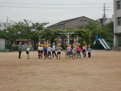 今日の児童集会では、たてわり班で、「犬と 猫と ねずみ」というゲームをしました。犬は猫を、猫はねずみを、ねずみは犬を追いかけて、手をつないだ円の周りや円の中をかけまわります。タッチされたら終了です。