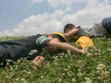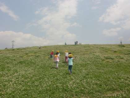 たくさんの色とりどりの花に迎えられて広場へ。なわあそびや、鬼ごっこをして芝生広場へ。なんと!芝生広場は真っ白!!シロツメクサが一面にひろがっていました。