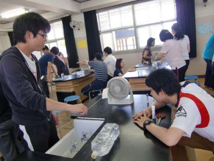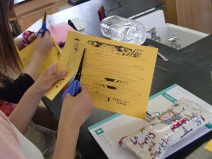 テーマは「飛行の科学」。飛行機はなぜ飛ぶのか、クイズや実験、これまでの授業実践でのエピソードを織り交ぜながらの研修に、生徒となった教員は引き込まれていました。学んだ理論を活かしての「切り紙飛行機づくり」では、全員が童心に帰って、夢中で飛行機づくりをしました。