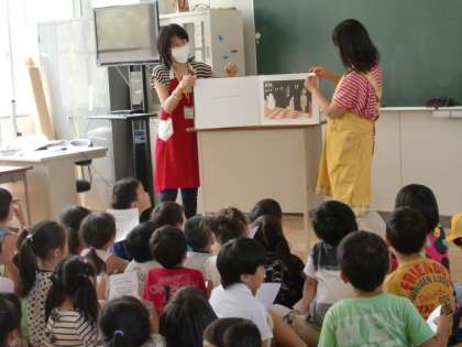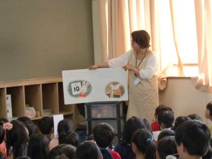 プールの着がえのため参加できない学級もありましたが、今日もたくさんの子どもたちが、お話の世界に魅了されていました。参加するとカードにスタンプがもらえます。1年間でいくつもらえるかな?