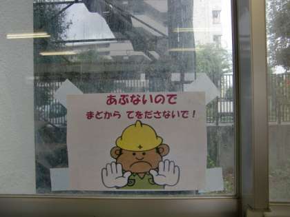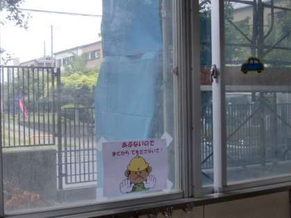 窓から顔や手を出したり身を乗り出したりしないよう、担任から注意をしていますが、業者さんが写真のような張り紙をつくってくださいました。とにかく無事故で工事を終えていただきたいものです。(発信:副校長 岡田香子)