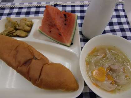 スパイシーチキン、ウインナーとじゃがいものスープ、スイカ、
