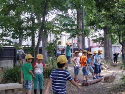 今日は、普段あまりえの森にやってこない子たちも遊びに来ていました。「珍しいね。いらっしゃい。」と歓迎すると、「運動場は厳重警戒(暑さ指数のことです)やけど、えの森は涼しいから来た」とのこと。毎日保健室に掲示し、放送でも知らせている「今日の暑さ指数」が、ずいぶん浸透しているようです。(発信:副校長 岡田香子)