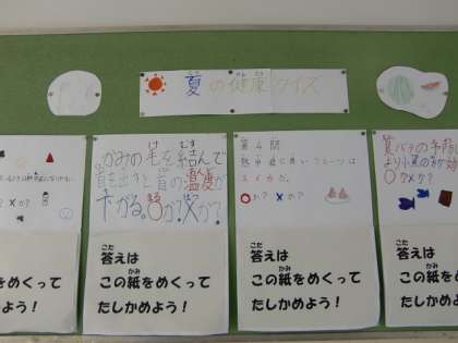 保健委員会の児童が「夏の健康クイズ」をつくり、保健室前に掲示しています。